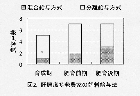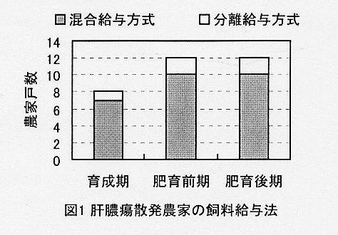 - 調査農家について過去3年間、肝膿瘍発生率が28%を超えている農家を多発農家、それ以外を散発農家に区分し、飼料の給与方法を調査したところ、散発農家では混合給与方式が多く、多発農家では分離給与方式が多かった(図1および2)。