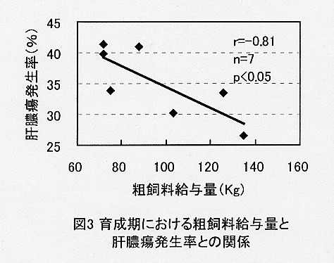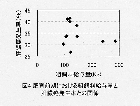 - 肝膿瘍発生率と育成期における1頭当たりの粗飼料給与量との間に有意な負の相関が認められ(図3)、肥育前期(図4)および後期にはその傾向が認められなかった。また、給与飼料中の粗飼料割合との間にも、育成期にのみ有意な負の相関が認められた。
