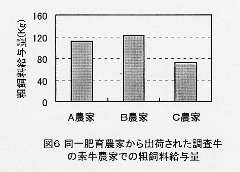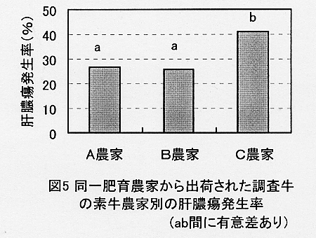 - 肥育農家1戸からの出荷牛について、素牛を供給した農家ごとに区分して肝膿瘍発生状況を調査したところ、素牛農家の間に有意な差が認められた(図5)。肝膿瘍発生の最も多かった素牛農家では粗飼料給与量(図6)および給与飼料中の粗飼料割合が最も少なかった。