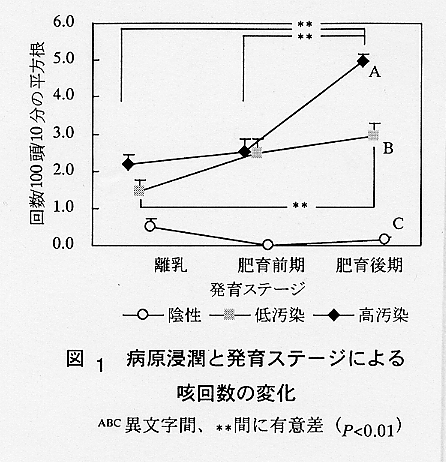 - 呼吸器感染症病原の陽性農場における咳回数は、肥育後期に有意に増加し、この時期に呼吸器感染症が多発している実態と一致するため、発病の指標として利用できる。さらにこの肥育後期における咳回数の増加は、病原の浸潤が高度な農場(高汚染農場)で著しく、病原浸潤状況の指標としても利用できる。(図1)