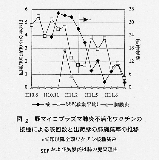 - 豚マイコプラズマ肺炎(MPS)不活化ワクチンの接種によると畜場におけるSEP(MPS様肺病変に相当)による肺の廃棄率の減少は、肥育後期豚舎における咳回数の減少と一致する(図2)。したがって、咳回数の計測により同ワクチンの効果を判定できる。