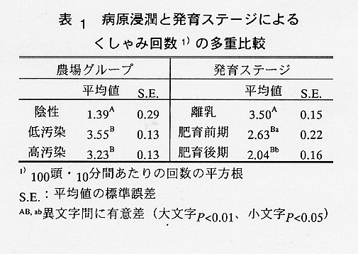 - 離乳からと畜場出荷までの各豚舎において、定期的に咳・くしゃみ回数を10分間計測することにより、養豚場における呼吸器感染症病原の浸潤および発病の状況をモニタリングできることを明らかにした。