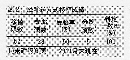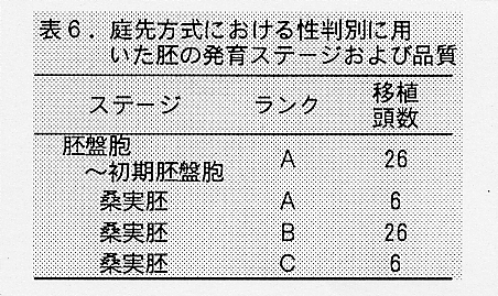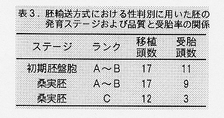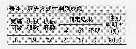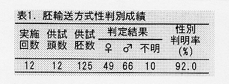 研究課題名:農家の庭先における牛胚の性判別実証試験 予算区分:道単 研究期間:平成10年度(平成7年〜9年) 研究担当者:陰山聡一,山本裕介 発表論文等:山本裕介・陰山聡一・南橋 昭・森安 悟・芦野正城・北野則泰・松崎重範 ・早川宏之・松村 篤, 農家の庭先における牛胚の性判別.(北海道牛受精 卵移植研究会会報,No.16,19-21,1997) 陰山聡一・山本裕介・山科秀也・岡本 康,胚輸送方式による牛性判別胚の 移植.(北海道牛受精卵移植研究会会報,No.17,25-27,1998)
