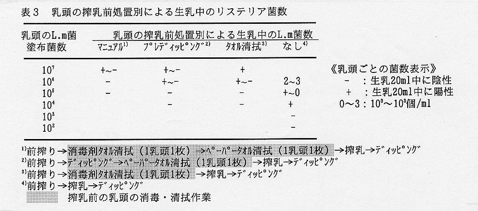 - 乳頭の消毒・清拭によるリステリア菌の生乳への混入防止対策(表3)