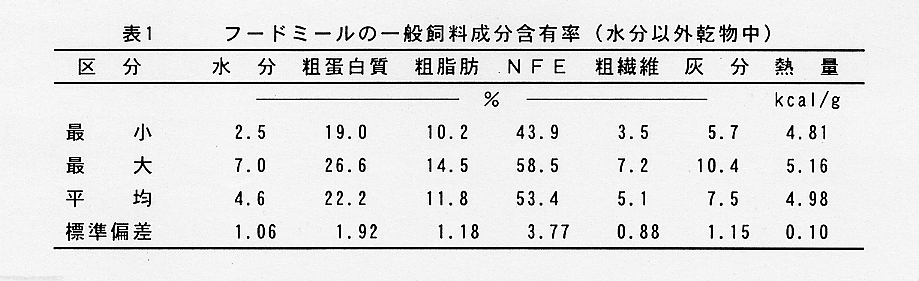 - 製造バッチを異にするフードミール18点の一般飼料成分を調査したところ、熱量を除く各成分の変動幅はいずれも広い。平均水分含有率は4.6%と低く、保存性や流通性は改善されている。フードミールの乾物中粗蛋白質含有率は22.2%、粗脂肪含有率も11.8%と高い(表1)。
