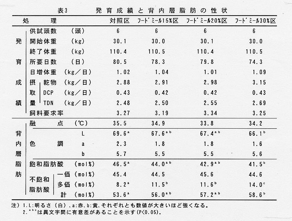 - 大ヨークシャ去勢豚を供試し、肥育配合飼料をフードミールで15〜30%単純代替しても嗜好性がよく、発育で劣らないが、フードミール区において多価不飽和脂肪酸の割合が高く枝肉脂肪の質は低下する(表3)。