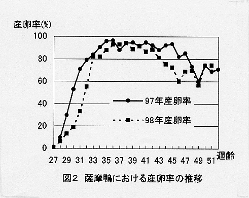 - 薩摩鴨の種禽用ヒナを7月上旬にふ化すると、翌年、水田放飼用ヒナをふ化するための種卵採取時期(40〜43週齢)の産卵率が高く約90%である(図2)。