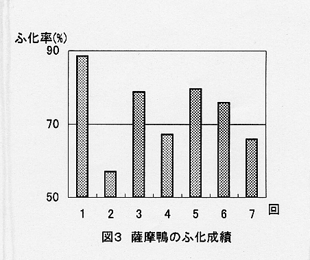- 薩摩鴨の種卵を用いて、ふ卵温度が37.2℃、湿度が1〜24日まで68%、その後ふ化まで78%の条件下で7回試験を行ったところ、対受精卵ふ化率は57.1〜88.5%の範囲にあり、平均が約73%であり水禽類としては高い方である(図3)。