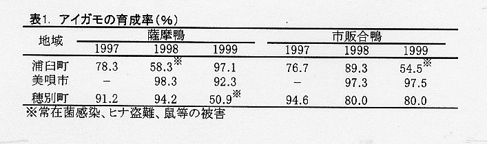 - アイガモヒナを、鶏ヒナに準じた温度管理で飼育すると育成率が高い。水田雑草に対する除草効果に薩摩鴨と市販合鴨とで差異がない。ブロイラー用飼料の給与が肥育に有効である。薩摩鴨の産卵率およびふ化率は水禽類としては高い方である。