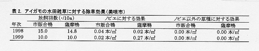 - 水田雑草に対する除草効果を得るための水田へのアイガモの適正放飼羽数であると従来からいわれている10〜15羽/10aで除草効果を検討したところ、残草量が0.27本/m2以下であり、その効果が確認できる。この羽数では薩摩鴨と市販合鴨の除草効果に差異がない(表2)。また、水稲への踏害もみられない。
