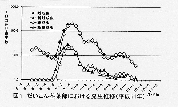 - 成虫の消長では、出現ピークは5月下〜6月上旬、7月中〜下旬、8月中〜下旬および9月中旬以降の4回である(図1)。