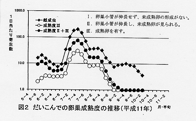 - 卵巣が発達した個体のピークは5月下旬〜6月上旬、7月中〜下旬および8月中〜下旬の3回である(図2)。