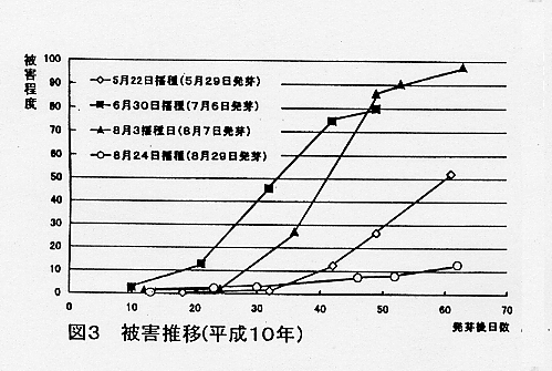 - いずれの時期に播種しても発芽から3週間程度は被害が発生しない(図3)。6月下旬〜8月上旬に播種した場合、被害が発生し始めると被害程度は急速に増加した。8月下旬に播種し場合、被害は緩慢に増加し、被害程度は小さい。5月〜6月上旬に播種した場合は被害が現れるのは遅いが、被害が出た後は急速に被害程度が増加する(図3)。