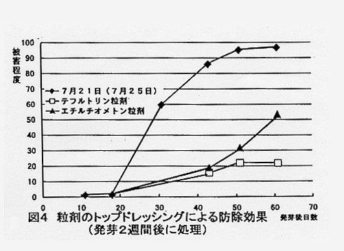 - 発芽後約2週間時点で粒剤のトップドレッシング処理を行うと効果が認められた(図4)。