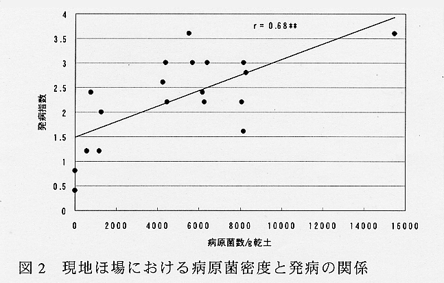 - 根腐萎凋病菌の土壌からの分離は変法駒田培地(駒田培地のpHを6.0とし、抗菌性物質はストレプトマイシン300ppm、PCNB1000ppm、クロラムフェニコール300ppmを添加する)が利用でき、菌密度を測定することができる。変法駒田培地によって測定された病原菌数とねぎの発病には高い相関があり、ねぎの発病をある程度予測できる(図2)。
