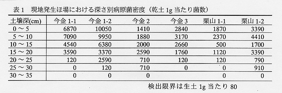 - 根腐萎凋病菌は簡易軟白ねぎのハウス土壌においては、深耕を行わない限り、地表下30cmまで分布している(表1)。これはねぎの根系分布と一致する。