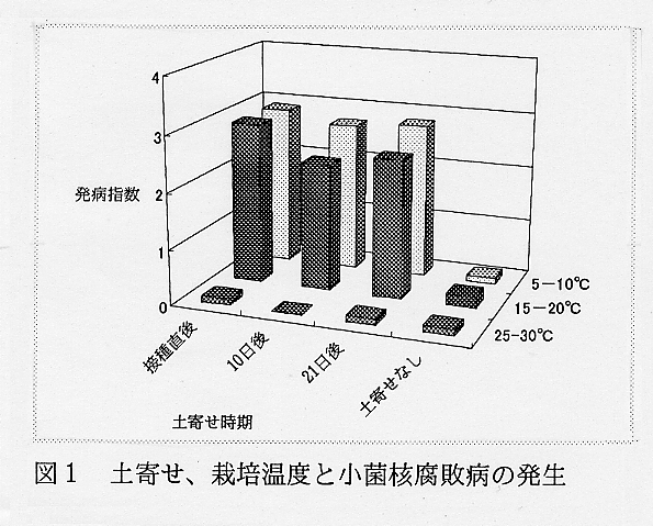 - 本病の感染・発病は20℃以下、土寄せなどによる保湿・高土壌水分が好適する(図1)。また、現地調査でも本病の発生は露地の10月・11月どり、越冬ねぎ、排水不良地、冷涼多雨年にそれぞれ多い傾向がある。従って、圃場の透排水性の改善と併せて、土寄せ後に平均気温が20℃以下になるような栽培では土寄せ前の薬剤散布が有効である。