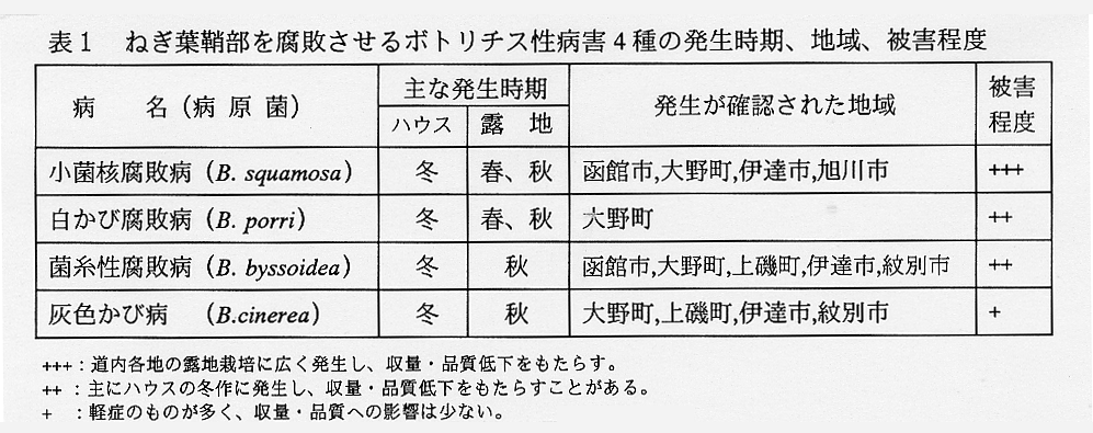 - 北海道のねぎに発生するBotrytis属菌による葉鞘部腐敗は、小菌核腐敗病(Botrytis squamosa)のほかに、白かび腐敗病(B.porri)、菌糸性腐敗病(B.byssoidea)、灰色かび病(B.cinerea)があり、後者3菌種は北海道では初めて確認された。
