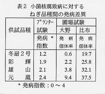 - 本病に対する抵抗性は、ねぎの品種・系統間で差があり(表2)、「冬扇2号」や「彩輝」などのF1品種は「元蔵」や「長悦」などの自殖品種より強いものが多いので、常発地では品種の選定も考慮する。