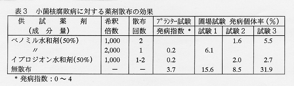 - 散布薬剤としてはベノミル水和剤1、000〜2、000倍またはイプロジオン水和剤1、000倍の1〜2回散布が有効・実用的である(表3)。その持続効果はベノミル水和剤が約3週間、イプロジオン水和剤が約2週間と考えられる。