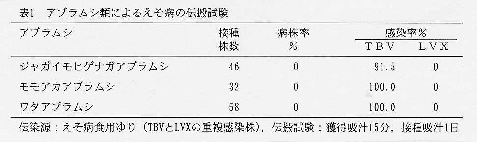 - TBVはアブラムシによって高率に伝搬されるが、LVXは虫媒伝染しない(表1、2)。