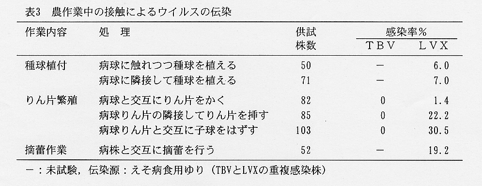 - LVXは、摘蕾・りん片繁殖・植付などの作業の際に接触伝染する(表3)。