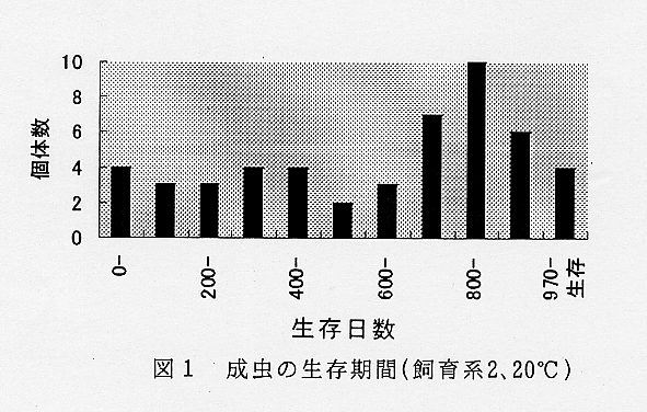 - 成虫は、20℃で産卵開始後から平均616.8日、最長981日以上生存している例があった(図1)。温量から野外で数年間の生存が可能と推定される。
