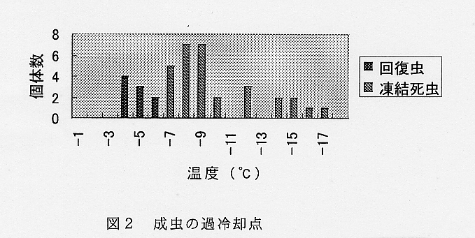 - 成虫の過冷却点は平均-9.2℃(-4.0℃〜-17.0℃)で、幼虫は平均-15.9℃(-12.5℃〜-19.5℃)である(図2)。