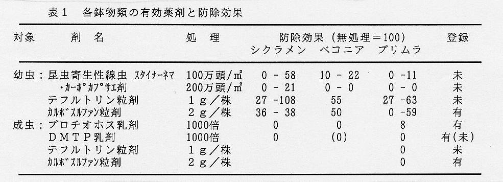 - 鉢物類(シクラメン、ベコニア、プリムラ)での防除対策として、幼虫には昆虫寄生性線虫剤(Steinernema carpocapsae)の株元散布が高い効果がみられ、テフルトリン粒剤、カルボスルファン粒剤の株元処理では密度を半減した。成虫にはプロチオホス乳剤、DMTP乳剤の茎葉散布やテフルトリン粒剤、カルボスルファン粒剤の株元処理が有効である(表1)。