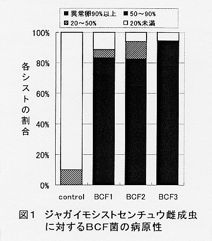 - ジャガイモシストセンチュウに対して高い寄生性を持つ糸状菌としてBCF菌(未同定、3菌株、BCF1〜3)を選抜した。PDA培地で生育させたBCF菌の菌叢上にジャガイモシストセンチュウ雌成虫を置いた生物検定では、2週間で約90%の雌成虫に寄生し、ほとんどの個体で全ての内蔵卵を侵した(25℃条件、図1)。