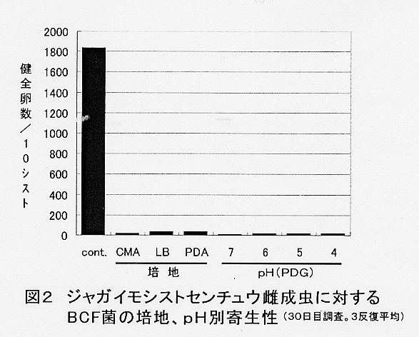 - 本菌は、PDA培地でよく生育し、赤褐色の菌叢を形成するが、胞子を形成しない。また、LB培地、CMA培地でも優劣なく生育し、それぞれの培地で培養したBCF菌のジャガイモシストセンチュウに対する寄生能も差がない(図2)。PDA培地での生育適温は25℃であり、至適生育pHは5〜7であるが、pH4においても高い寄生性を示す。