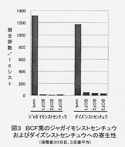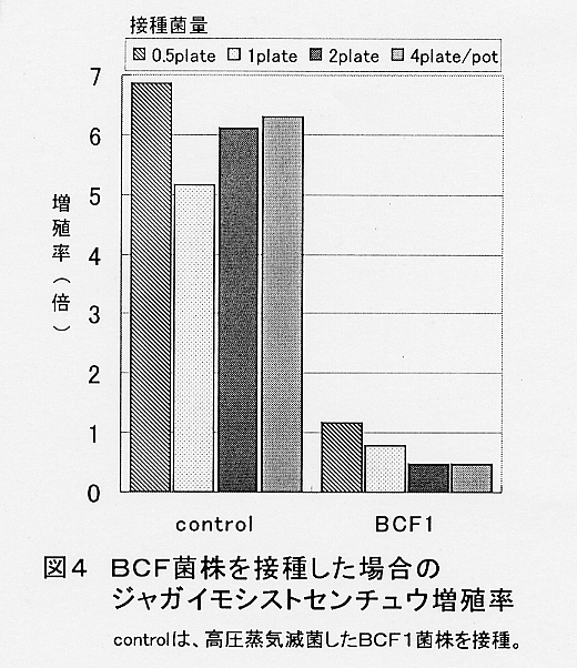 - ジャガイモシストセンチュウ汚染土壌に本菌のPDA培養菌体を混和し、馬鈴薯(男爵)を栽培した場合、1作後の線虫増殖率は、対照区が5〜7倍だったのに対し、BCF菌接種区では、1ポット当たり1プレート以上接種では1未満となり、収穫時密度は初期密度より低下した(図4)。