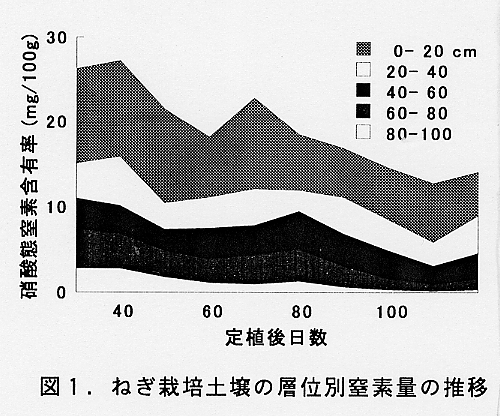- 軟白ねぎでは、根の90%が作土層(0〜20cm)に存在するため、作土層以下の層位の硝酸態窒素濃度の変化は小さく(図1)、土壌診断は、作土層のみを対象とすればよい。