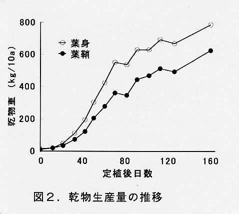 - 乾物生産および窒素吸収特性から、ねぎの生育期は、定植後30日目頃までの生育初期、伸長期、生育割合が低下する80日目頃以降の生育後期、の3期に分けられる(図2)。