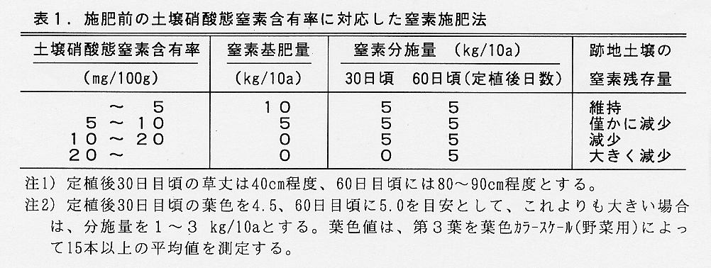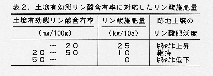 - 以上のことから、施肥前の土壌硝酸態窒素含有率に対応した窒素施肥法を表1に、土壌有効態リン酸含有率に対応したリン酸施肥量を表2に示す。