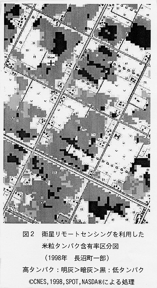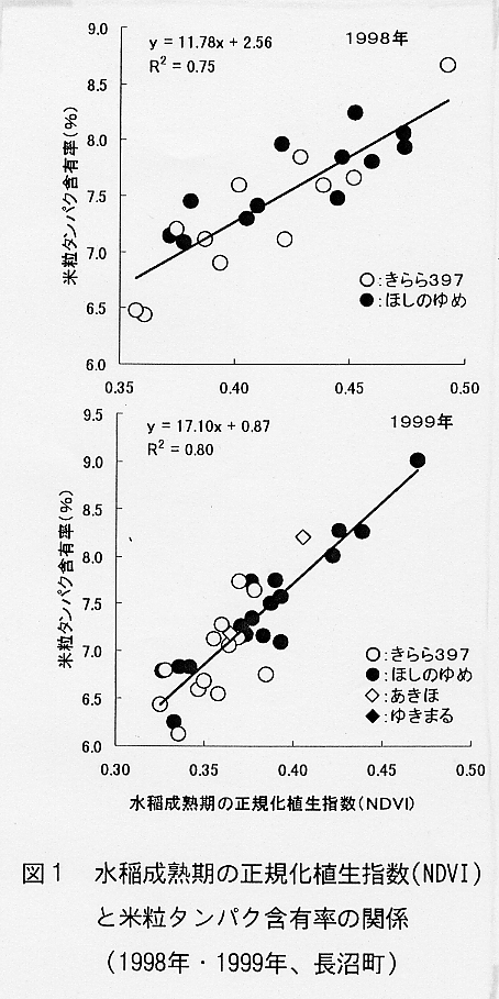 - 大規模水田が広く分布する夕張郡長沼町において1998年・1999年に実施した調査でも、石狩川下流域で得られた傾向と同様に、水稲成熟期のNDVIと現地圃場で実測した米粒タンパク含有率との間には正の相関があり、衛星データを用いて個々の圃場の米粒タンパク含有率の推定が可能である(図1)。