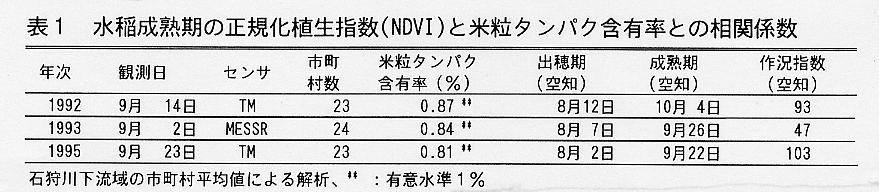 - 本道の主要な稲作地帯である石狩川下流域を対象として、1992年・1993年・1995年の3ヶ年について、水稲成熟期の正規化植生指数(NDVI)と市町村別の平均米粒タンパク含有率との関係を検討したところ、両者の間にはいずれの年次についても高い正の相関があり、NDVIが大きくなるほど米粒タンパク含有率が高くなる傾向にある(表1)。