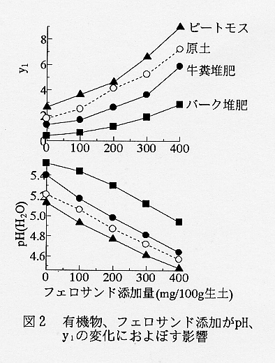 - 有機物施用がそうか病の発病におよぼす影響は土壌pHよりも交換酸度(y1)によって良く説明される。バーク堆肥の施用はy1を減少させ、発病度を高める(図1)。