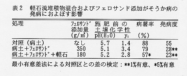 - そうか病を抑制する目的で軽石流堆積物を客土する場合は、土壌酸度調整資材を併用する。