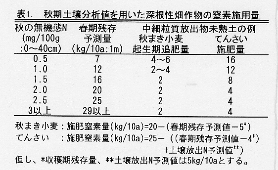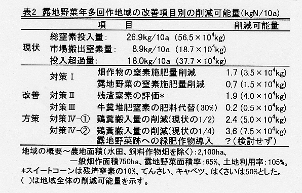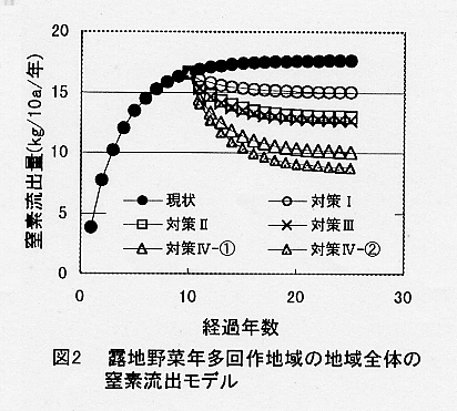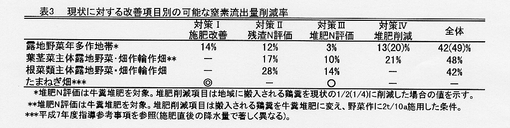 研究課題名:硝酸態窒素の環境負荷の実態解明と軽減技術の開発 1.露地野菜地帯における環境負荷の実態解明と農地生態系活用による環境負荷物質の浄化 予算区分:補助(国費) 研究期間:平成11年度(平成7〜11年) 研究担当者:三木直倫、安積大治、須田達也 発表論文等:露地野菜年多作地帯における深根性畑作物を活用した硝酸態窒素の流出削減,日本土壌肥料学会講演要旨集,第46集,2000(掲載予定)