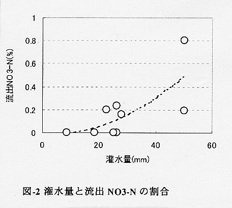 - ハウスの暗渠排水中のNO3-Nは、施肥量、灌水量、花の生育時期によって変化した。なかでも、灌水に伴う変化は大きく、20mm灌水以上で流出が始まり、NO3-Nの流出割合は20〜30mmで0.2%未満、50mmでは0.5%を上回る(図2)。また、排水中のNO3-N濃度は高いが、流下過程で水域に及ぼす影響は判然としない(図3)。
