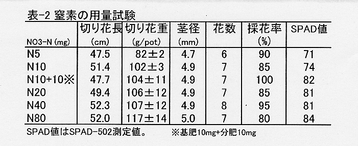 - カーネーションの定植直後の生育は、土壌のNO3-Nが10mg/100g区で良好であり、生育量及び葉色はNO3-N -N20mg/100g区でほぼピークに達する(表2)。窒素肥料の過剰施用は土壌のNO3-N含量を高め、カーネーションの生産性と品質低下を招く。