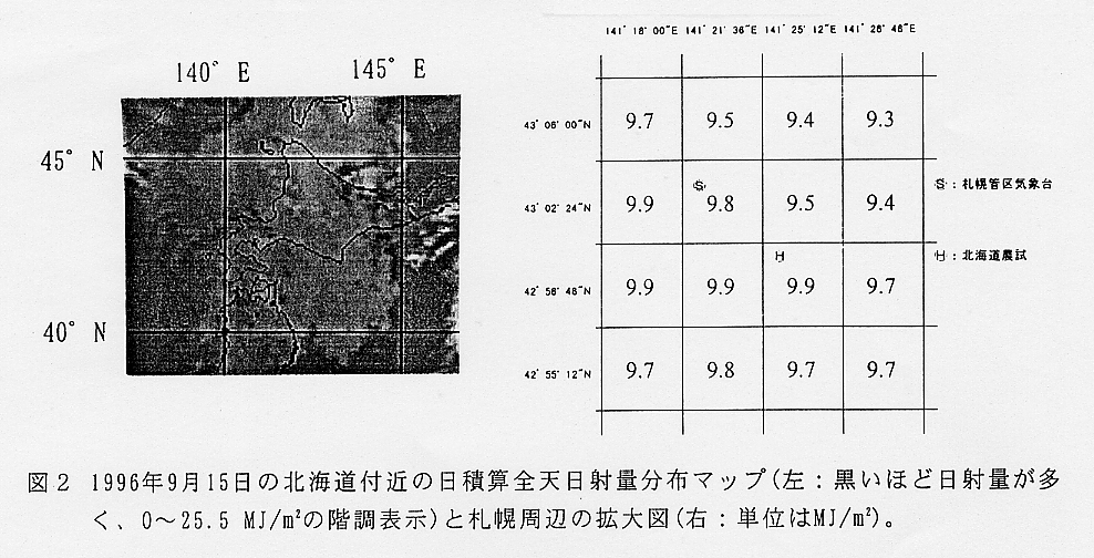 GMS赤外データによる北海道地域での積算日射量の評価、日本農業気象
