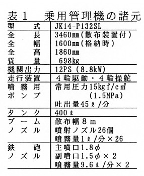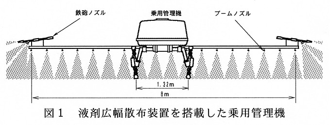 - 乗用管理機の液剤散布用ブームノズルの両端に鉄砲ノズルを取り付けることにより散布幅約15mの広幅散布が可能になり、従来の幅10mの散布装置に比べて作業能率が1.5倍に向上する。