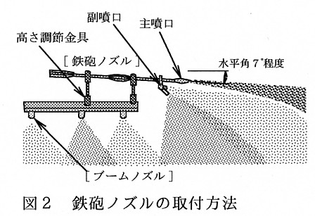 - 広幅散布装置は乗用管理機用液剤散布用ブームノズルの先端に鉄砲ノズルを取り付けるだけの簡易な構造である(図1)。鉄砲ノズルは噴射距離の調整が可能で、手元散布用の副噴口を持つ機種を用いる。また、噴射角度を調節するための金具を取り付け、主噴口の噴射角度を水平よりやや下向き(水平角7°程度)にする(図2)。