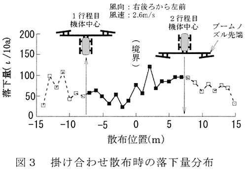- 鉄砲ノズルの噴霧距離を約4.5mとして散布幅8mのブームノズルと組み合わせると最大散布幅は17m程度になるが、両端の落下量が少なくなる。そこで、隣接する行程と2m掛け合わせて散布することにより散布幅15mで実用的な落下量の分布が得られる(図3)。
