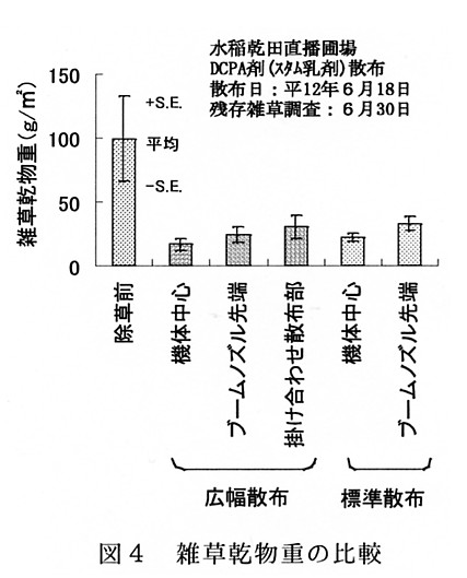 - 1ha規模の大区画圃場における作業時間は散布幅15mの広幅散布で37分/ha、散布幅10mの標準散布で55分/haとなり、広幅散布により作業能率が向上する(表2)。また、除草剤散布後の雑草の乾物重は、広幅散布と標準散布に顕著な差はなく、同等の除草効果が得られる(図4)。