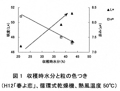 - コンバインで高水分時(34〜43%)に収穫し、循環式乾燥機で乾燥した春まき小麦の粒色は通常水分(21〜27%)で収穫した時よりも明度が増大し、赤みが低下するため色つきが不足する(図1)。農産物検査では、高水分で収穫し循環式乾燥機および静置式乾燥機で熱風温度50℃以上の条件で乾燥した時に光沢不足と判断されることが多い。