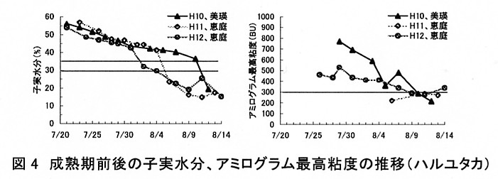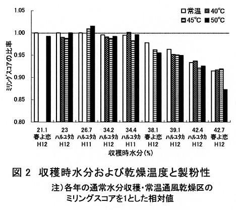 - 製粉性は高水分で収穫するほど劣るが、子実水分35%以下であれば通常水分で収穫した場合とほぼ同等である(図2)。