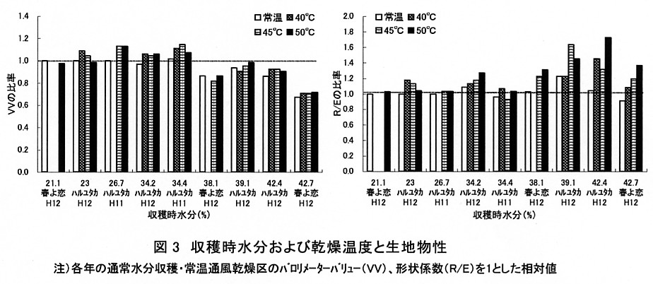 - 子実水分30%以上の高水分の春まき小麦は、製粉性、生地の物性などの内部品質の低下を避けるため、子実水分35%を上限に収穫し、乾燥による粒の色つき不足や蛋白質の熱変性による物性の低下を避けるため、熱風温度45℃以下で乾燥することが望ましい。